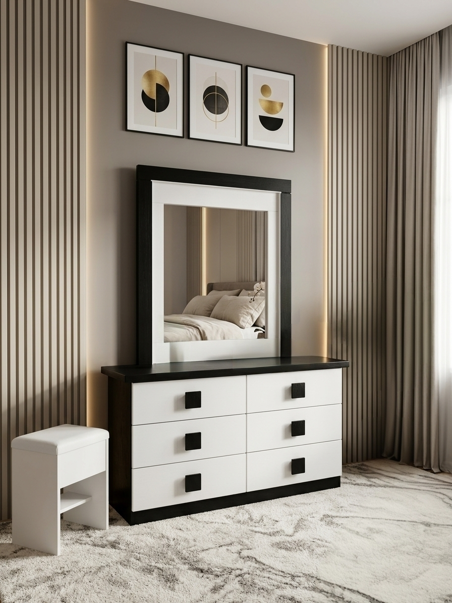 تسريحة بتصميم أنيق مع مرآة كبيرة.